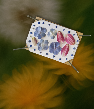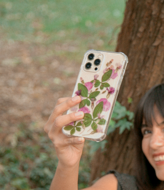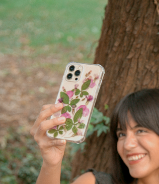 Funda para celular con pétalos de rosas, hortensias y hojas de jacaranda