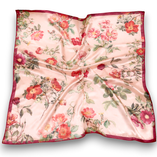Mascadas confeccionadas en seda sintética sublimada, con diseños inspirados en ilustraciones botánicas antiguas.
