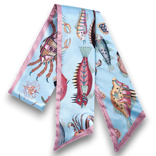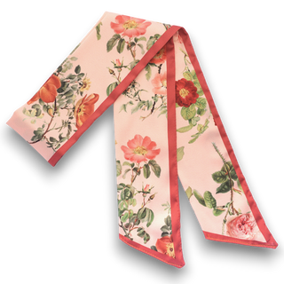 Twillys de seda sintética sublimada, con diseños inspirados en ilustraciones botánicas antiguas. Accesorios versátiles para cabello, cuello o bolso.